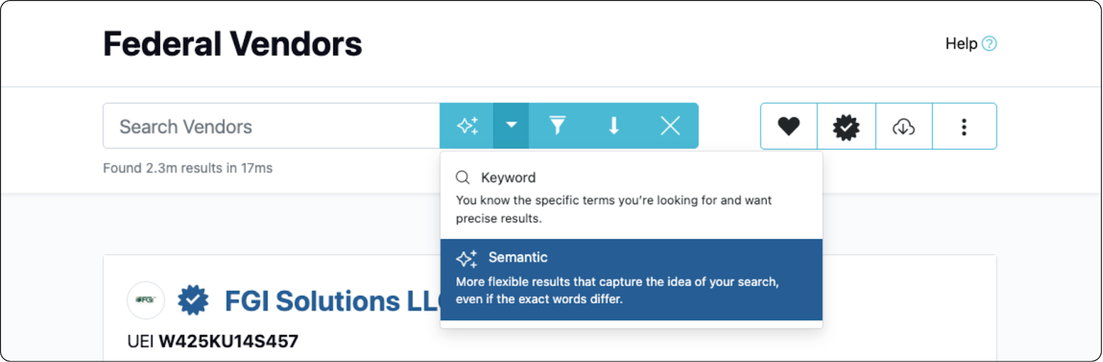 The fastest and easiest place to start is AI Insights. Just tell us what kind of vendors you’re looking for (ones with specific set-asides, NAICS codes, agency relationships, etc.), and we’ll instantly point you toward promising matches.